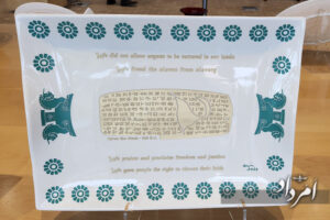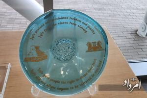 Yet the exhibition went beyond festivals. In another section, where the sounds of celebration faded, the glass panels displayed iconic symbols—from Cyrus the Great’s Cylinder to excerpts of messages of peace and freedom—this time etched in glass rather than stone. Babaknia has created 60 works inspired by Cyrus the Great, noting: